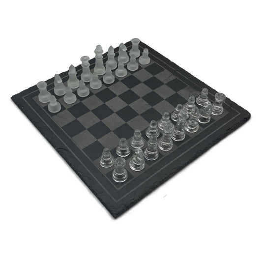 Schachbrett mit Glasfiguren